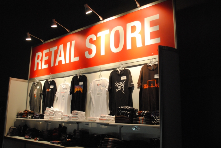 It wouldn't be a convention without the opportunity to buy some stuff. There were a couple of booths dedicated to buying souvenirs and other gaming shirts and accoutrements. The official "RETAIL STORE" had id and QuakeCon shirts and baubles.