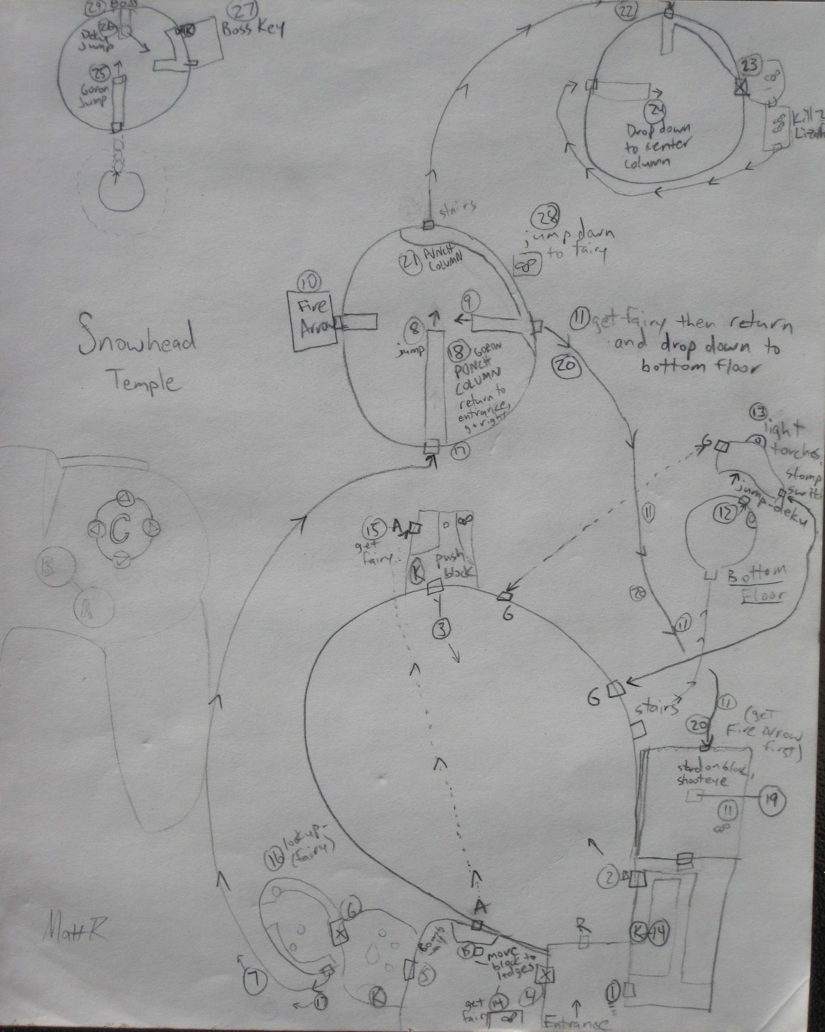 Keeping track of a huge overworld was the main challenge for early Zelda games, but the difficulty shifted in favor of labyrinthine dungeons/temples in the jump to 3D (Wind Waker being an interesting exception). If you like to play these newer Zeldas more than once then I suggest grabbing a pencil and paper; MM has without a doubt some of the most mind-bending temples of all, and the time limit and terrible pause screen maps only magnify the difficulty. Beyond that, having a physical map makes for a great souvenir in a way that no achievement “trophy” or filled inventory could ever duplicate.