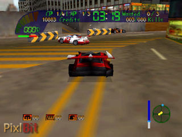 Zombies. I thought they were talking about actual zombies, but the computer cars act just the same. The AI in this game is so simple-minded, I've never even seen an AI car finish a race. All they will do is try to wreck each other, and sometimes, the player, which brings me to the damage system. If the damage meter is depleted, you go boom. Pretty much everything causes damage to the car, including hitting ramps, going over small bumps, and even holding the accelerator during the initial countdown. Repairing the car is as simple as pressing the R button, which comes at the cost of credits. These are earned by ramming other cars, running over zombies, and finishing races.