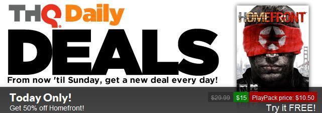Today you can buy Homefront for $15! That's 50% off. Play pack subscribers will get a bigger discount of 65%, making the game's price $10.50. Check back tomorrow for Tuesday's deal.