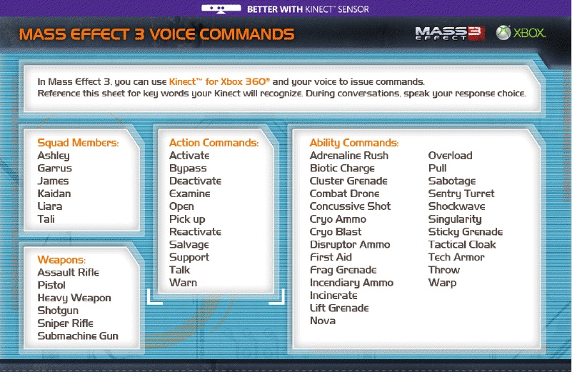 Mass Effect 3 Kinect Voice Command Cheat Sheet