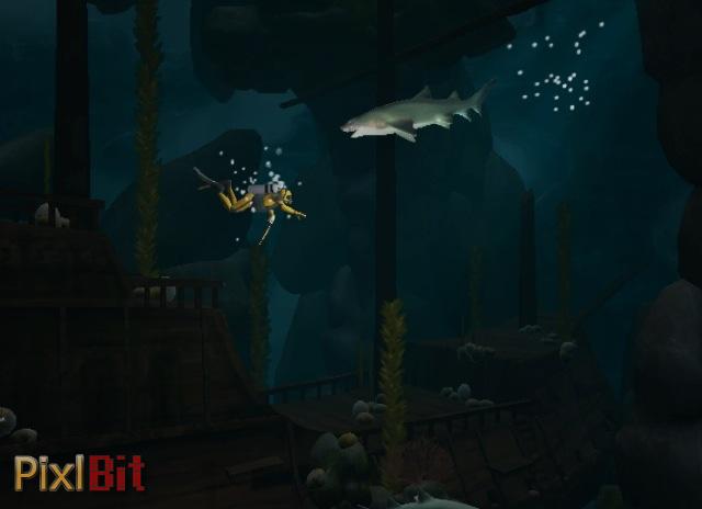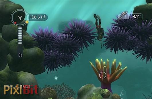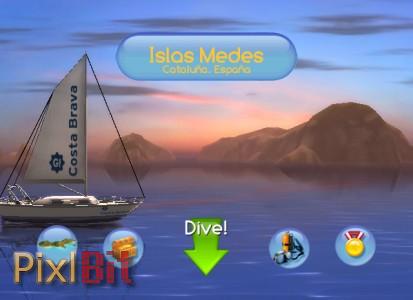 Dive: The Medes Island Secret allows players to take control of a diver looking for treasures in a 2D oceanscape. Through the use of the Wii pointer, players will direct the diver while using the B button to push him forward. While navigating the waters, looking for sparkling dots of treasure, the air in the tanks of the diver will slowly deplete.