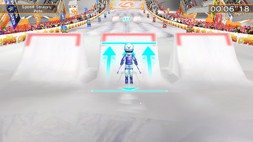 Synchronized Swimming is a rhythm game that brings something new to the table, and while it’s a little difficult to catch on, it's a whole lot of fun. Using only the Wii Remote, you shake it in different directions to the beat of some public domain orchaestrations, occasionally shaking the controller in a circle. In a similar vein is Speed Skating, which combines the concept of Synchronized Swimming and Mogul Skiing. Basically, it's a rhythm game where you have to carefully time swinging your Wii Remote and Nunchuk to the rhythm of your movement.
