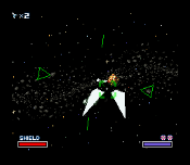 Star Fox is basically an on-rails Space Harrier with far more depth. Unlike Space Harrier, Star Fox sets itself apart from other 3-D shooters of the day by giving you more control over your ship, called an Arwing. Star Fox offers four different control schemes; Type A and B are traditional flying controls (inverted y-axis) while Type C and D keep the y-axis real. The Arwing’s main actions are shoot/brake/bomb/boost, which Type A maps to the Y/B/A/X buttons. Flying and barrel-rolling aren’t as smooth as in the 64 version, but it does not detract from the experience.