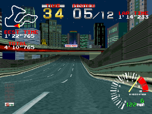 What did impress me about Daytona and Ridge Racer was the sense of speed and smoothness in 3-D graphics. It was like nothing I'd ever seen. Those games were both leaps and bounds over Cruis'n USA, which was Nintendo's/Midway's competitor to Ridge Racer and Daytona (Nintendo's real racing gem, however, was the perfectly competent Wave Race 64). I kind of miss the days when arcades, primarily through Namco, Sega, and Midway, were proving grounds for home video game technology.